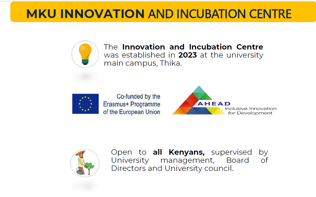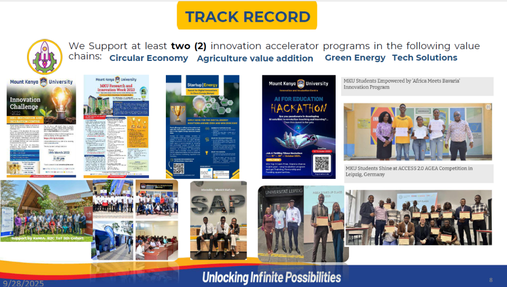 - Innovation Challenges: MKU organizes competitive innovation challenges, such as the Mount Kenya University Innovation Challenge, 2022, 2023, and 2024 which offered winners prize money to be used for product or service development at the incubation centre.